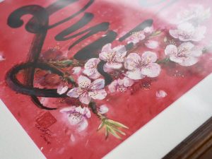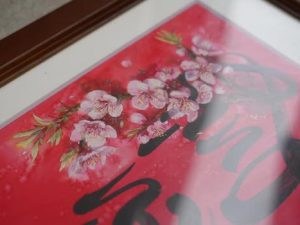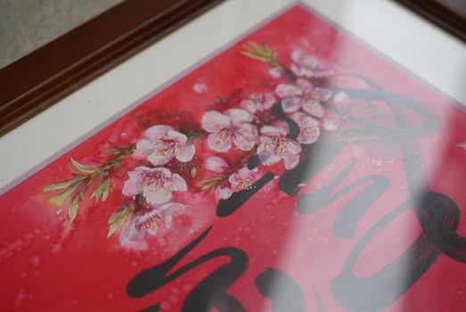 Hoa đào nở trên nền đỏ, là sắc xuân gọi lộc, là dấu hiệu của khởi đầu hanh thông và gia đạo ấm yên.